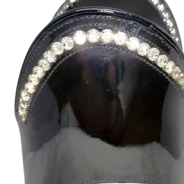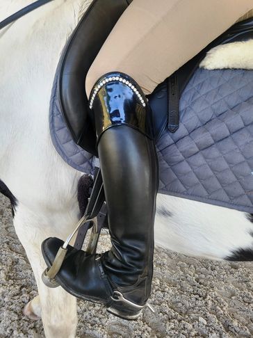 I have custom made boots that are 40 years old. The leather is beautiful, and the boots were perfect for my hunter days. Now that I am riding dressage, my boots looked short! However, the boot crowns solved my problem. The quilted pattern with black crystals adds just subtle sparkle. Love the new look.